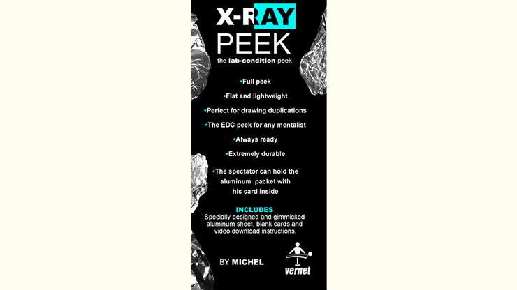 Le spectateur écrit une information secrète sur une carte. Vous enveloppez la carte dans une feuille d'aluminium et vous jetez instantanément un coup d'œil à l'information. Un coup d'œil complet sous les yeux du spectateur ! Le spectateur peut même tenir le paquet d'aluminium et vérifier que vous ne pouvez rien voir à travers ! Voici X-Ray Peek, une façon naturelle, impossible et en conditions de laboratoire de jeter secrètement un coup d'œil à n'importe quelle information. Dites adieu à votre portefeuille traditionnel : celui-ci est plat, léger, d'apparence innocente et très trompeur. Le moyen idéal pour tout mentaliste !